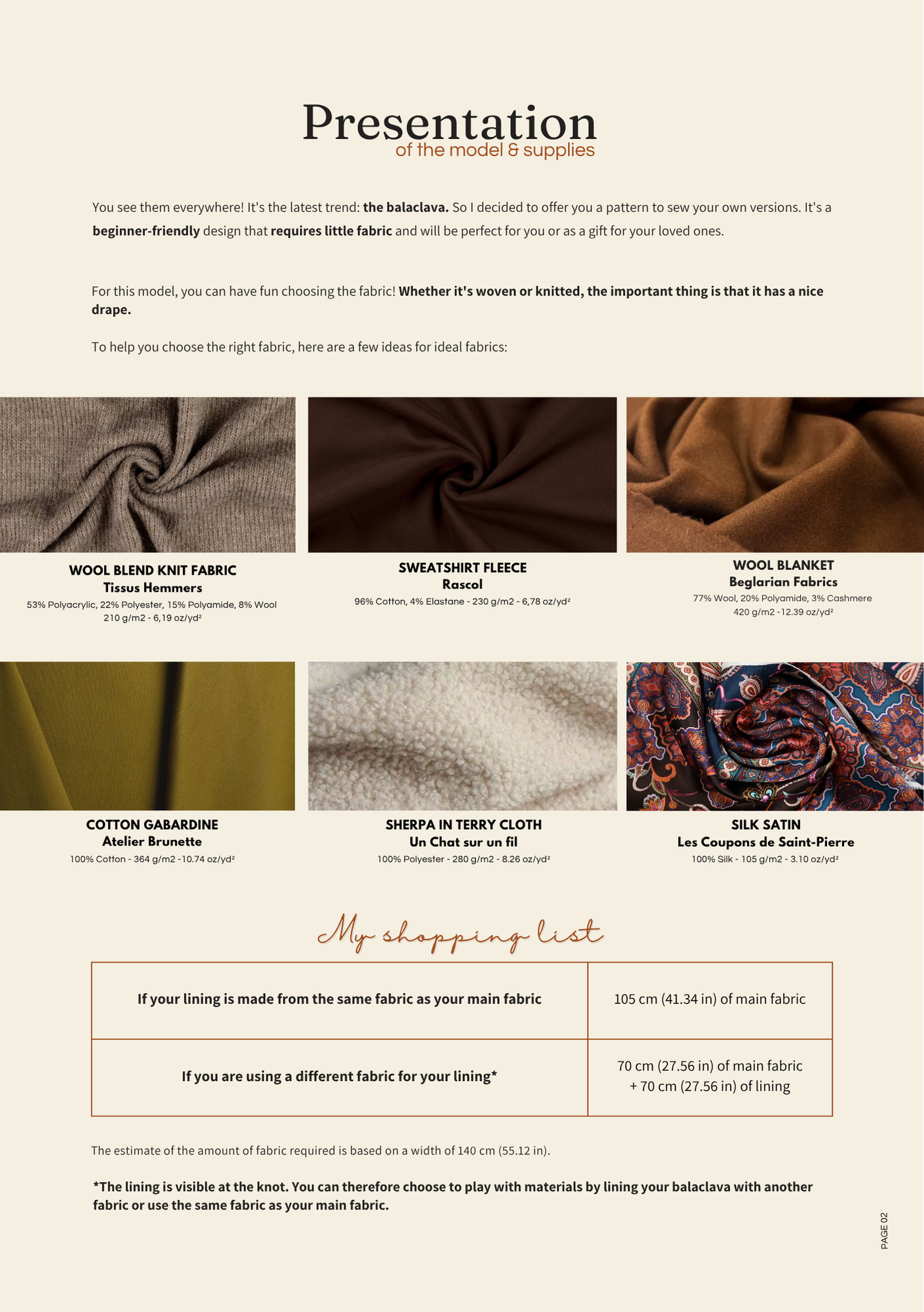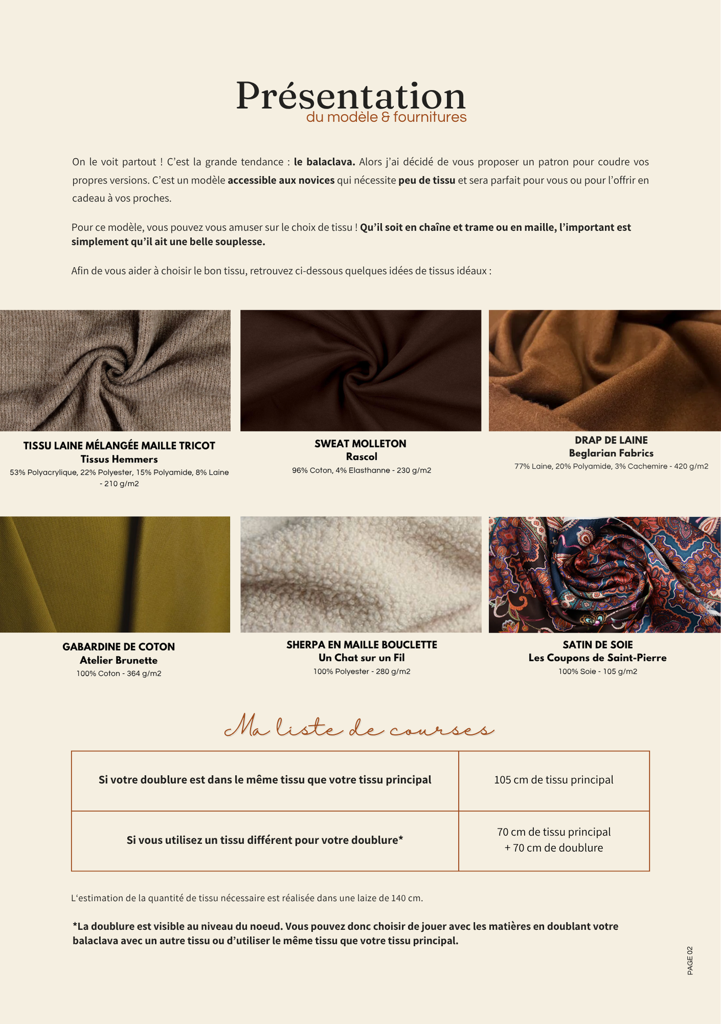 It's everywhere! It's the big trend: the balaclava. So I decided to offer you a pattern so you can sew your own versions. It's a beginner-friendly design that requires very little fabric and will be perfect for you or as a gift for loved ones. Plus, you can have fun choosing your fabric! Whether it's woven or knitted, the important thing is simply that it has a nice drape.