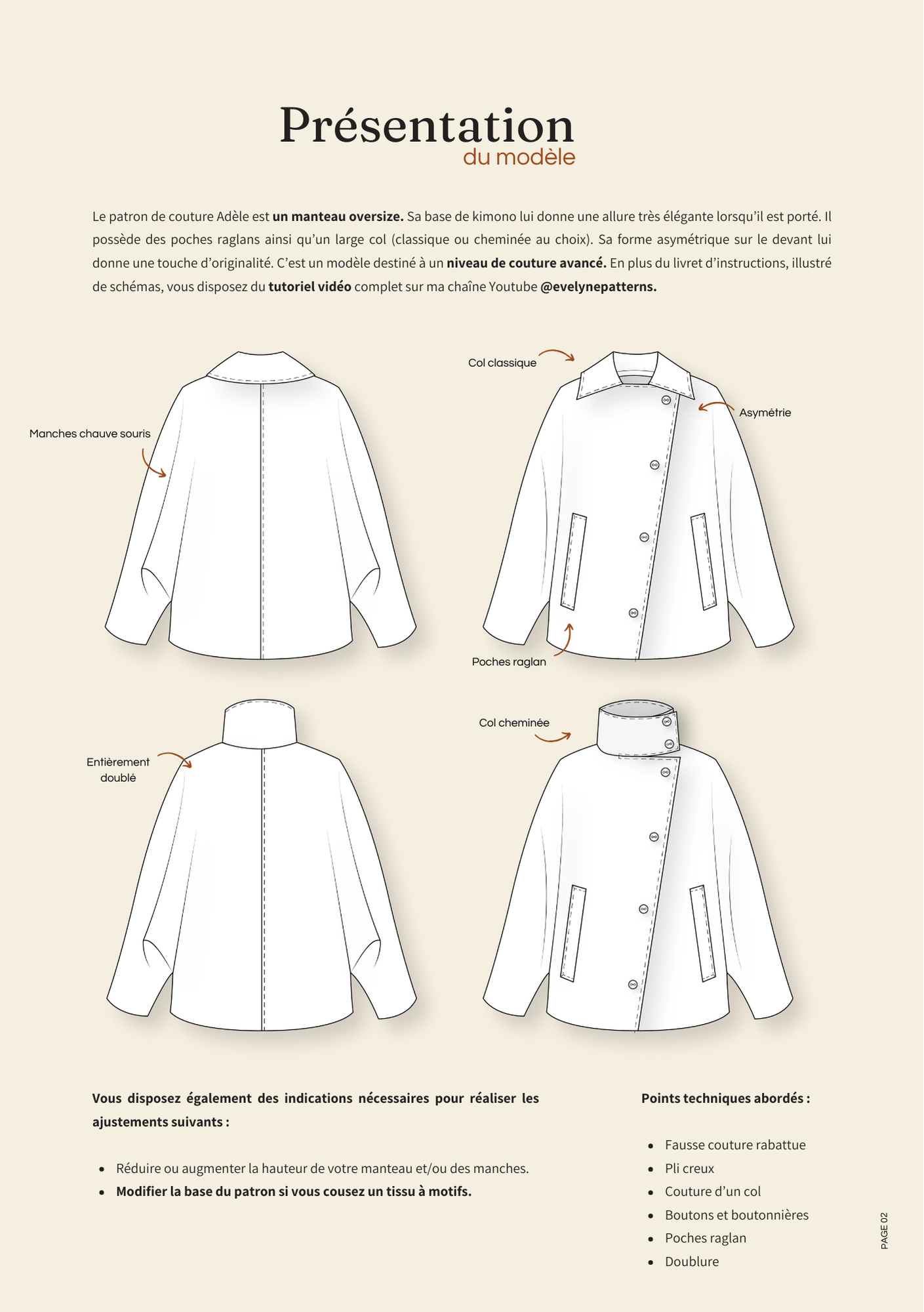 C’est un modèle destiné à un niveau de couture avancé. En revanche, il est idéal pour la couture de votre tout premier manteau : sa coupe fait que le devant, le dos et les manches ne sont qu'une seule et même pièce.