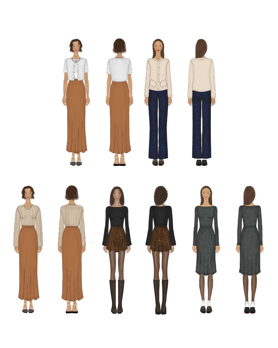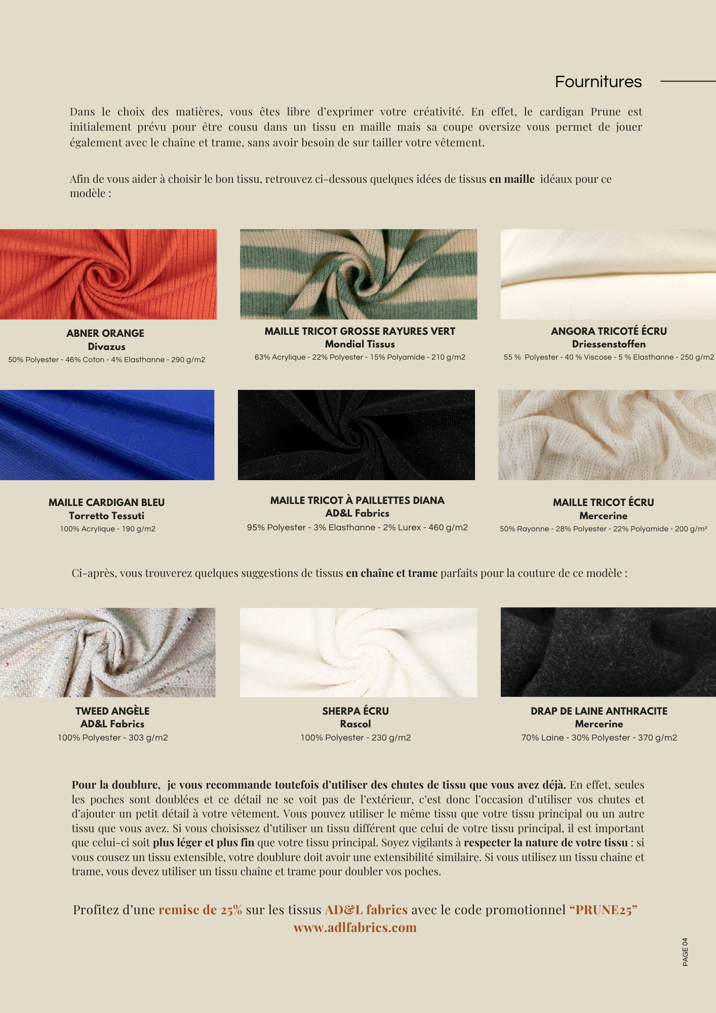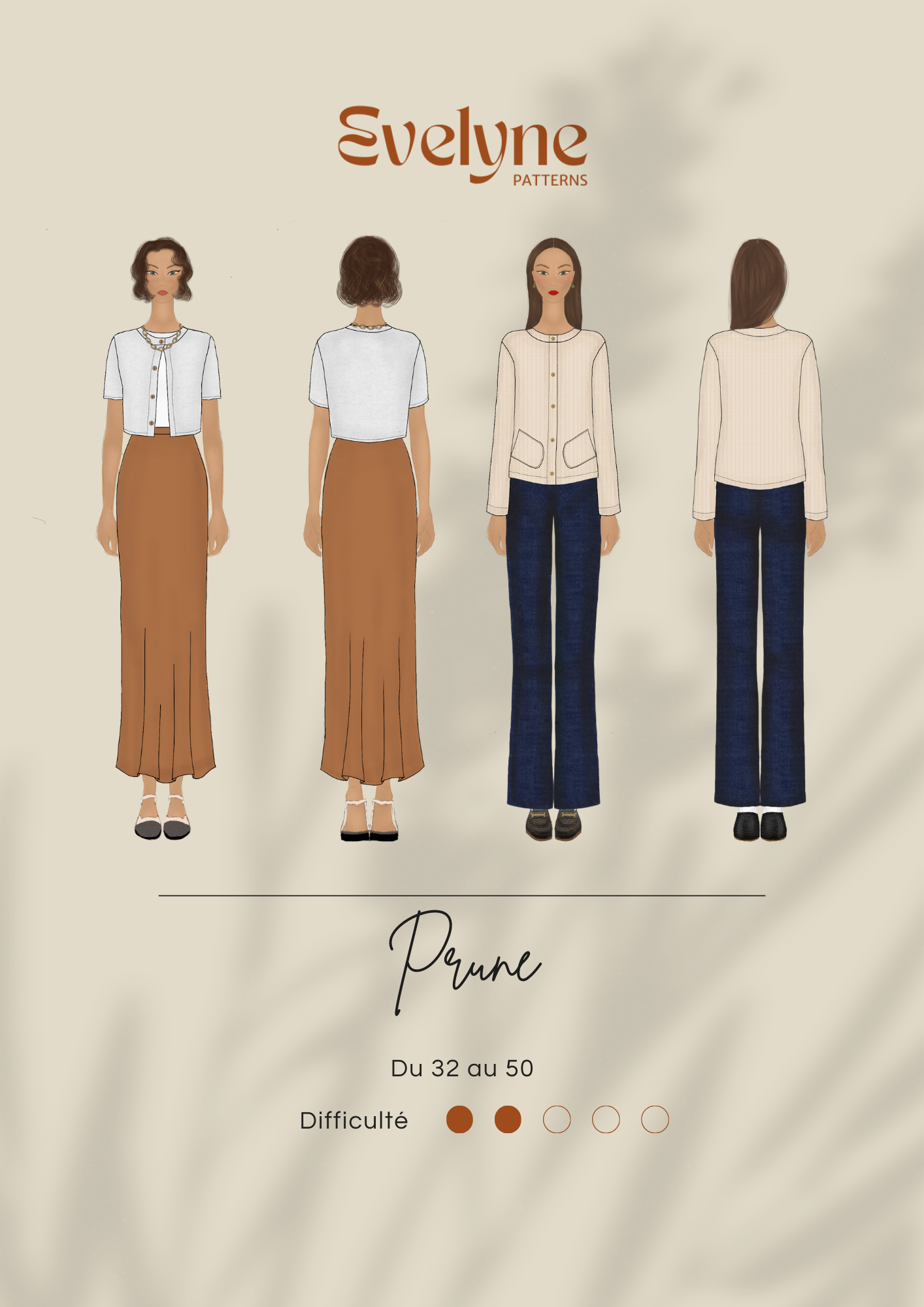 This pack includes the sewing patterns Prune and Isolde, two sewing patterns with multiple versions to enrich your wardrobe with timeless pieces. The cropped version of the Prune cardigan pairs wonderfully with the Isolde skirt and allows you to obtain a comfortable and elegant set.
