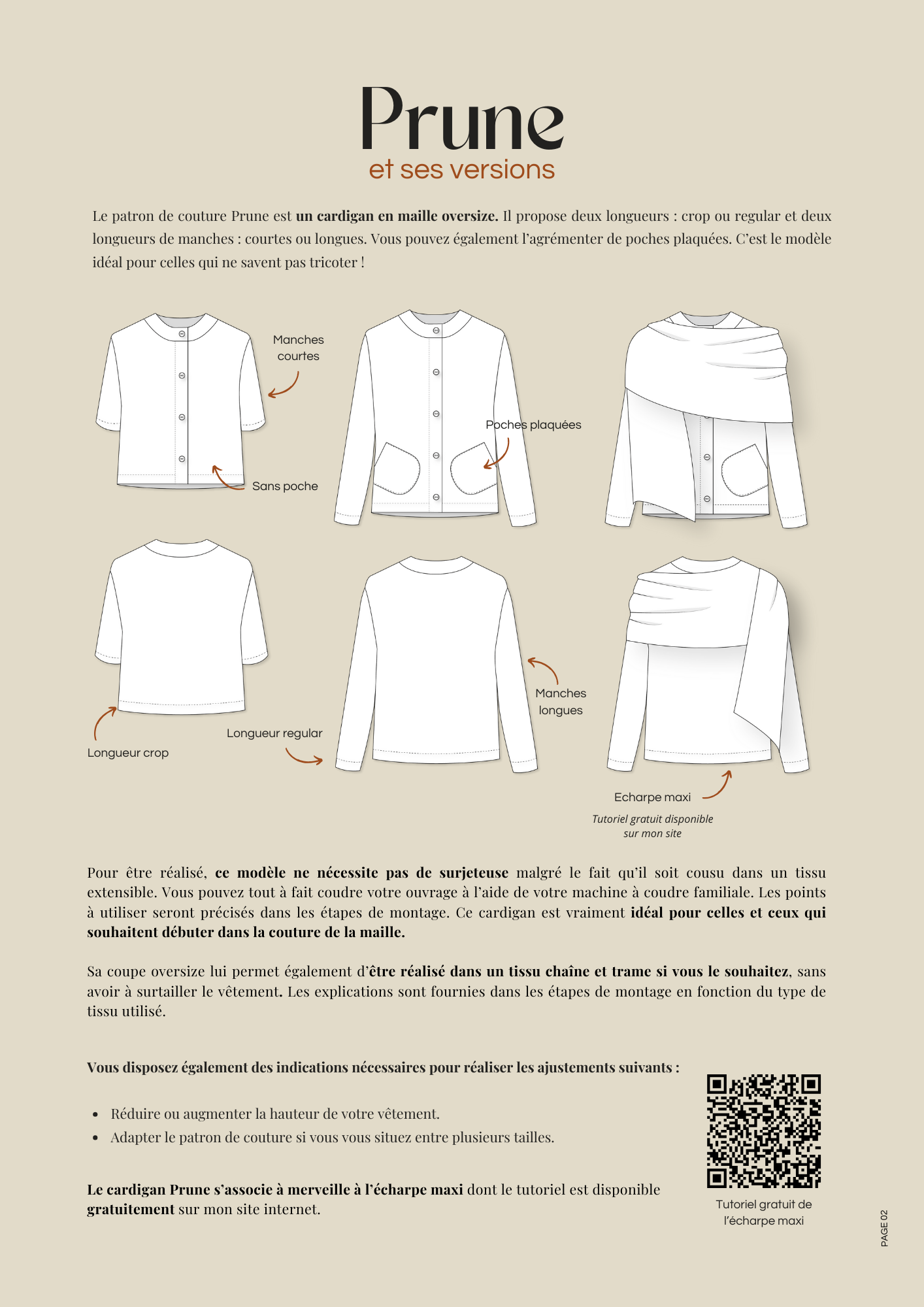 The Prune sewing pattern is an oversized knit cardigan. It comes in two lengths : crop or regular and two sleeve lengths : short or long. You can also add patch pockets. This is the ideal model for those who don't know how to knit!
