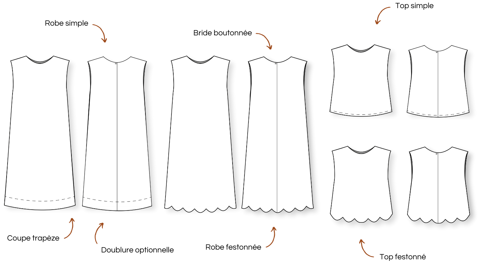 Les valeurs de couture sont incluses. Elles sont de 1 cm (0,39 in) sur l’ensemble du patron sauf au niveau des ourlets où elles varient selon la version cousue. Cela est précisé dans les étapes de montage.